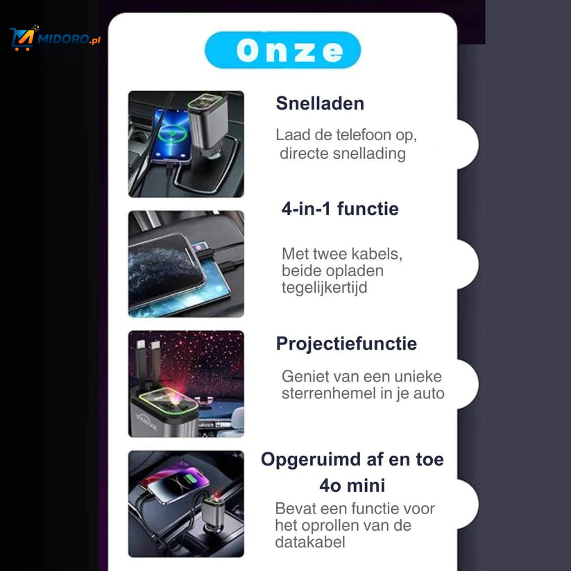 Masz dość czekania, gdy Twój telefon powoli się ładuje podczas jazdy? AutoCharge™ 120W to idealne rozwiązanie dla każdego, kto chce ładować szybko i efektywnie. Ta ładowarka 4-w-1 nie tylko oferuje super szybkie prędkości ładowania, ale także dodaje piękne RGB gwiezdne niebo do Twojego doświadczenia w samochodzie!