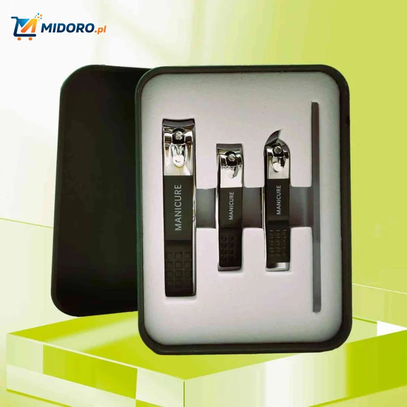 Zestaw zawiera duży i mały obcinacz do paznokci, narzędzie do usuwania brudu oraz pilnik do paznokci – wszystko w wygodnym opakowaniu prezentowym.